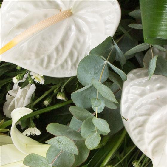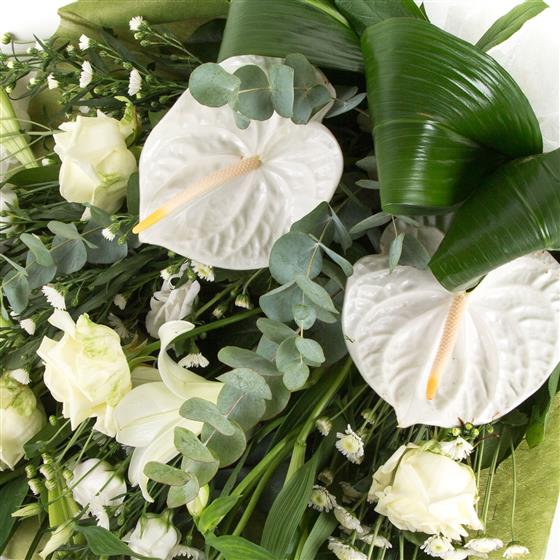 A simple combination of cream and white blooms and unusual greens. Anthuriums, lilies and roses are included in this modern style sheaf.