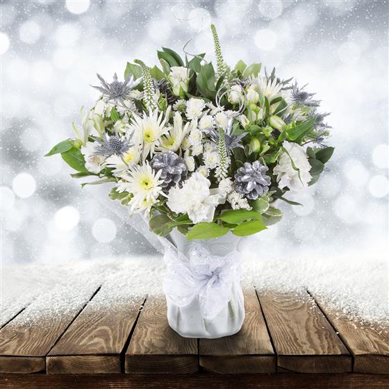 A stylish bouquet of all white blooms, including roses and carnations intermingled with silver eryngium and eucalyptus.