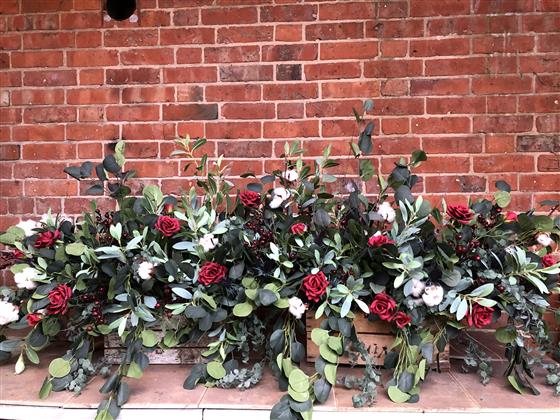 Pictured here is a 5ft long display of all faux flowers in some of the very realistic faux greenery with berried and red roses. Please call to order if you require a different size or colour, alternatively you can add your colour requirements in the comments when ordering. Call for varying sizes.