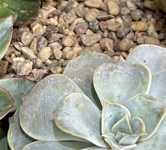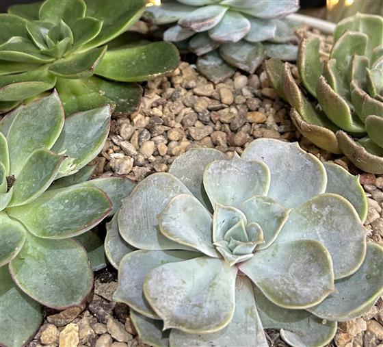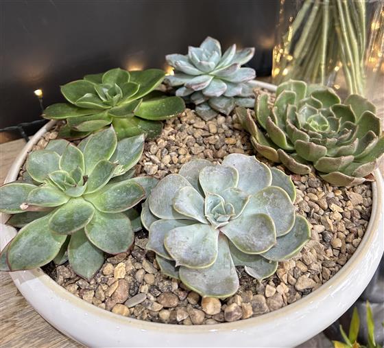 An array of succulents in a low cream dish. Lovely and very low maintenance.